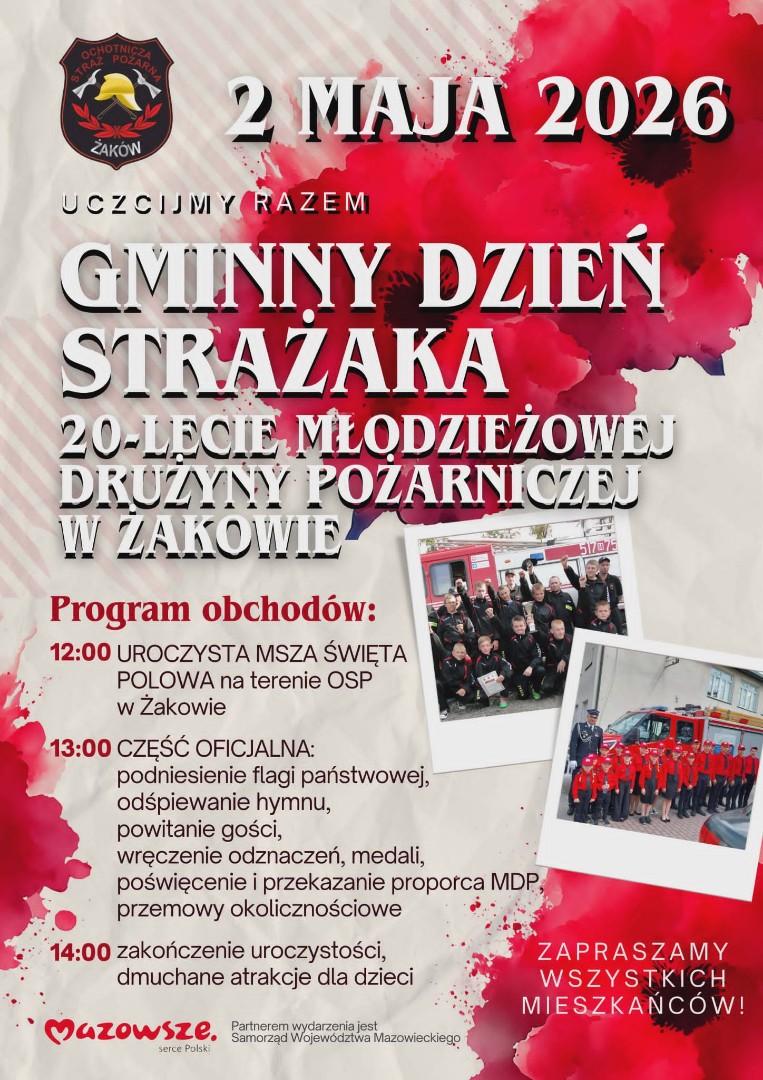 Serdecznie zapraszamy w dniu 2 maja na uroczyste obchody Dnia Strażaka i 20 lecie Młodzieżowej Drużyny Pożarniczej w Żakowie.