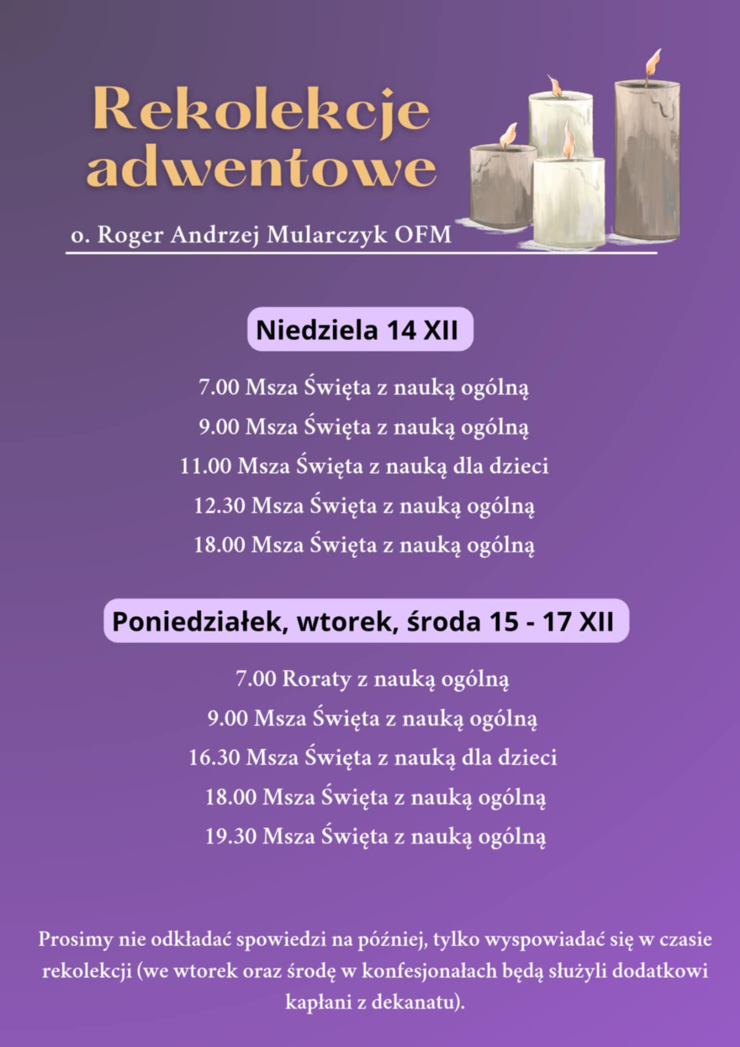 - Za tydzień rozpoczniemy nasze rekolekcje adwentowe. Plan rekolekcji podany jest na stronie internetowej naszej parafii oraz w gazetce parafialnej.